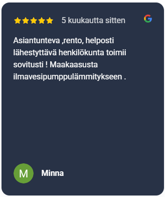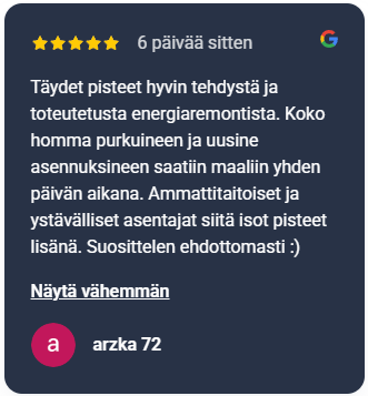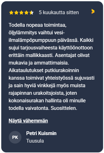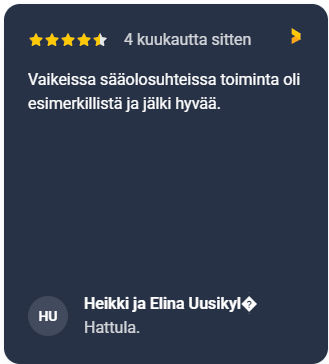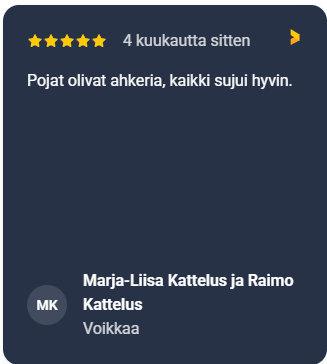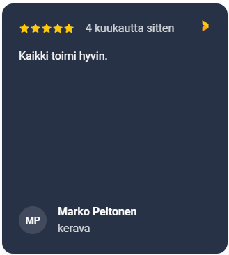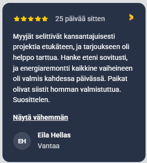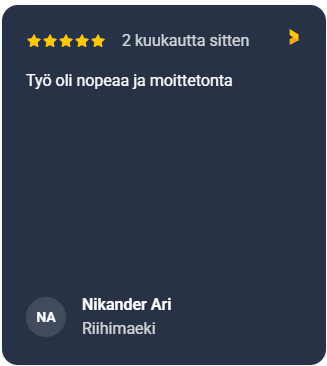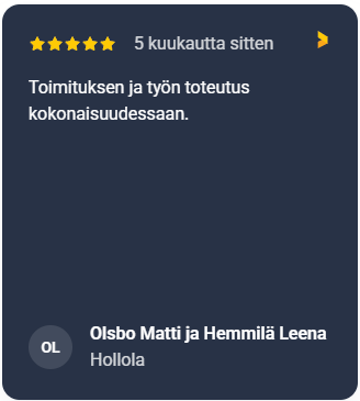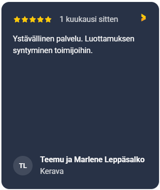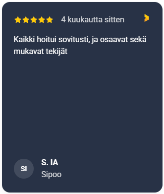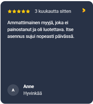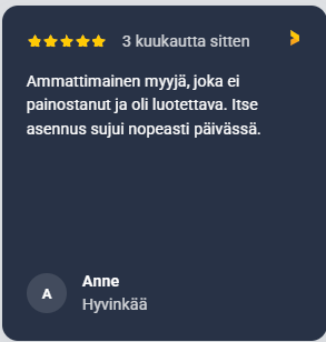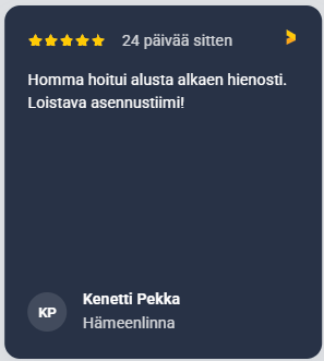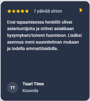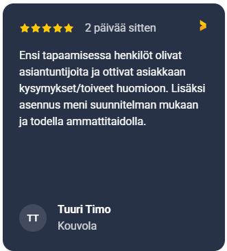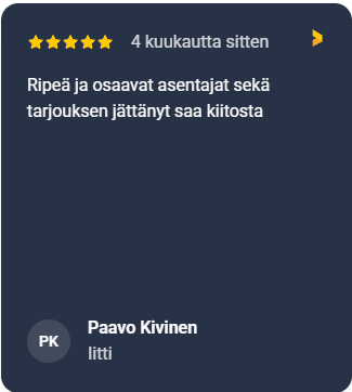 ”Työt meni hyvin. Asentajat osasivat työnsä,tulivat ajallaan ja hoitivat hommat päivän aikana. Suosittelen.”